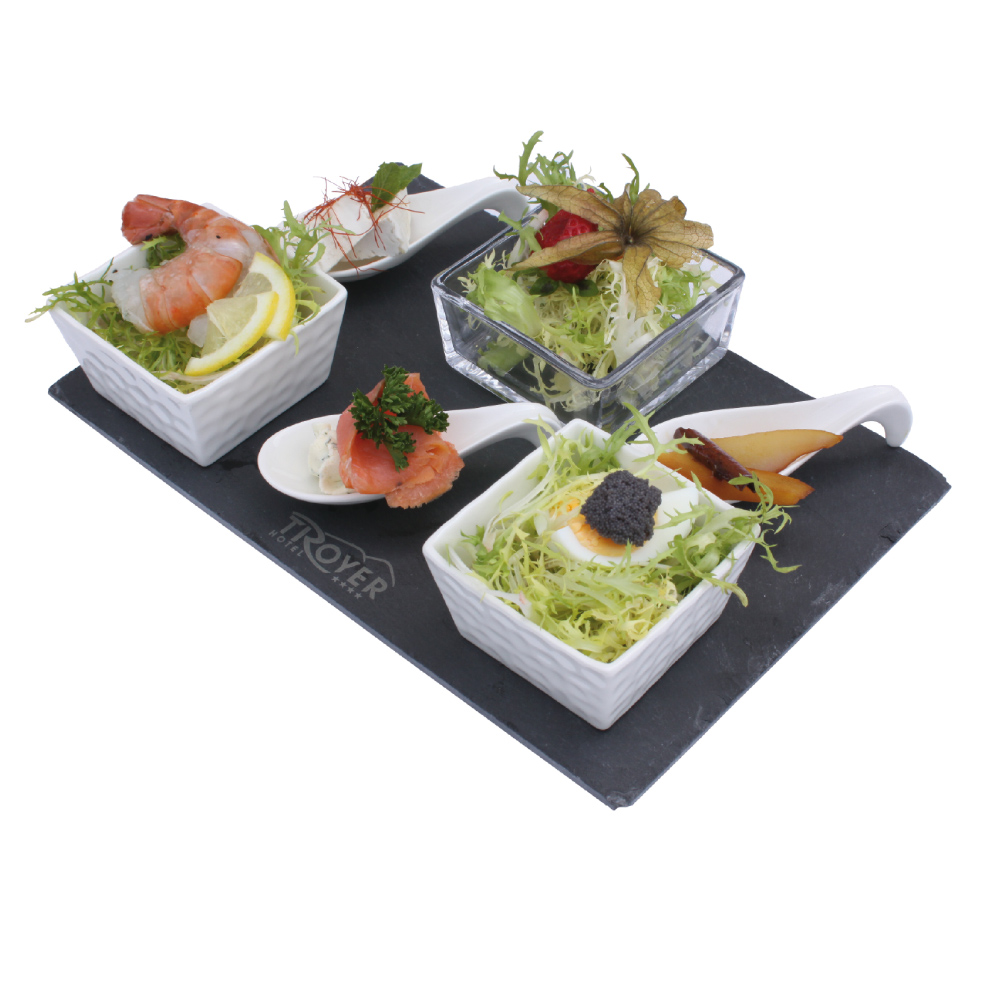 3 misky s lyžičkami Furmos - misky s lyžičkami na kamennom podnose, rozmer: 300x210x60 mm