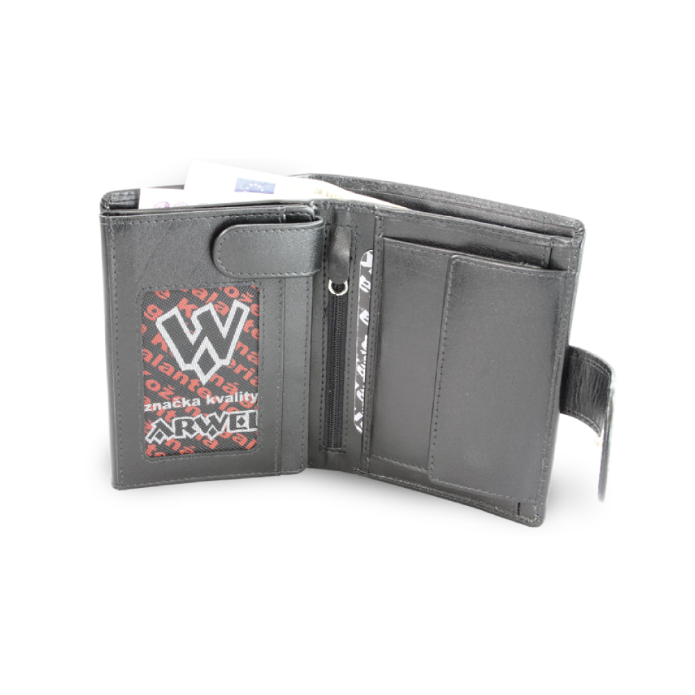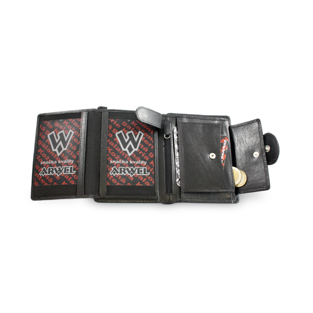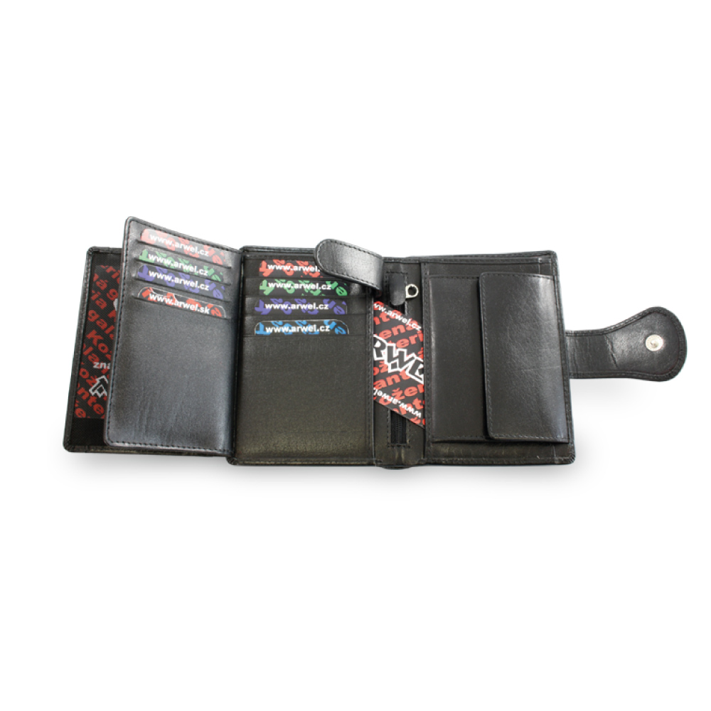 2 priehradky na bankovky, klopnové vrecko na mince, 10 vreciek na kreditné karty,  malé vnútorné zipsové vrecúško. Základný rozmer 13 x 10 cm.