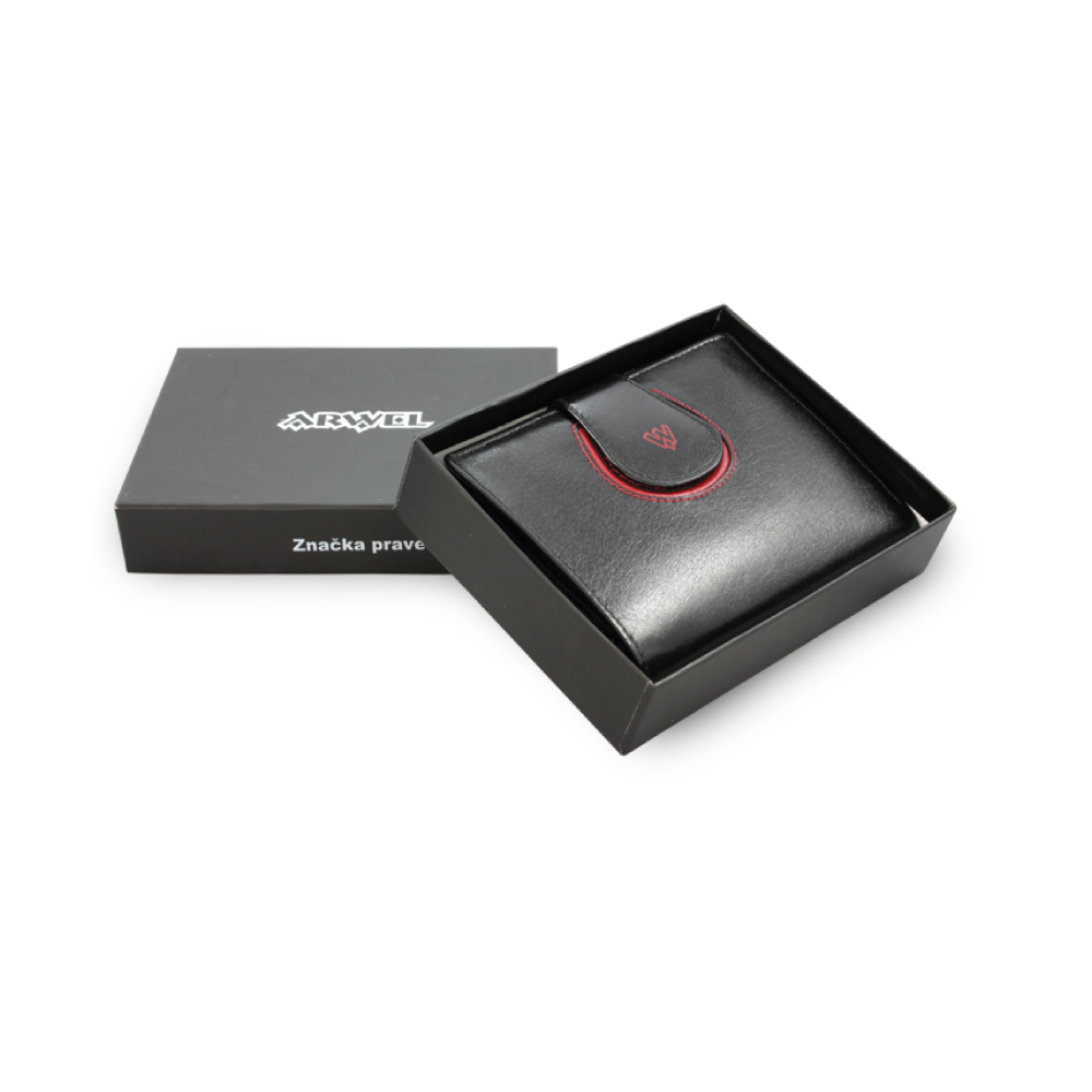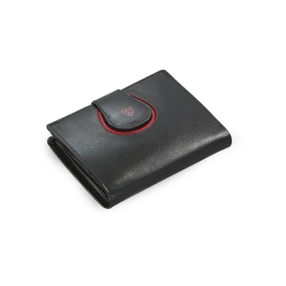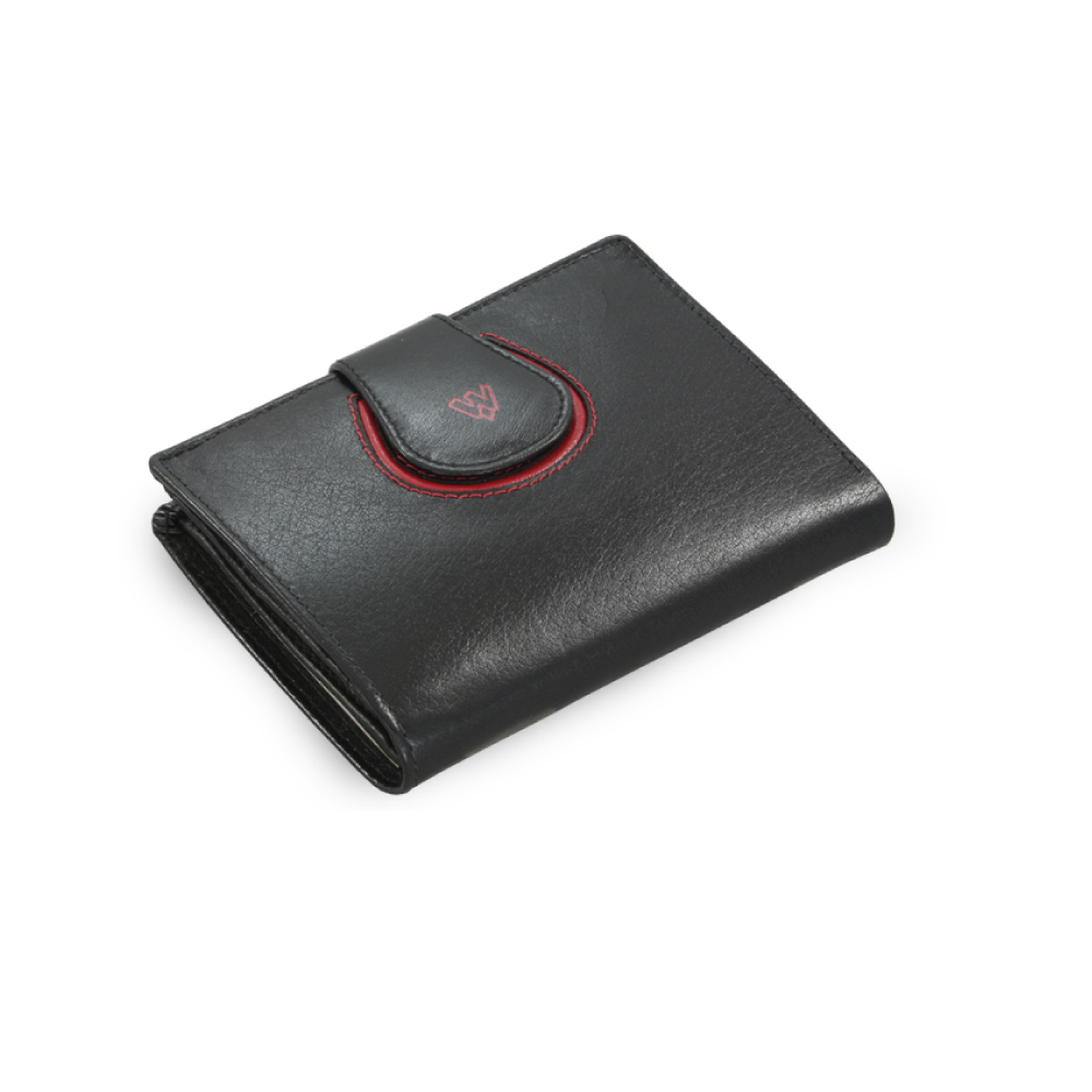 Vnútorné rozloženie: 2 priehradky na bankovky, klopnové vrecko na mince, 10 vreciek na kreditné karty, malé vnútorné zipsové vrecúško. Základný rozmer 13 x 10 cm. Materiál: Buff DD. Farba: černo-červená.
