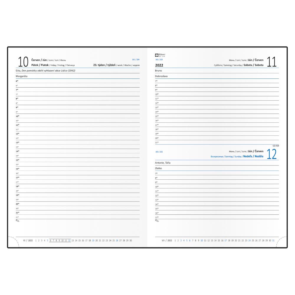 Rozmer: 143 x 205 mm Formát: A5 Kalendárium: denné české a slovenské menné Jazykové mutácie: CZ, SK, ANG, D, RU Poťahový materiál: štruktúrovaný materiál s lesklým povrchom Papier: biely s perforovanými rožkami Počet strán: 352 Väzba: šitá Väzba V