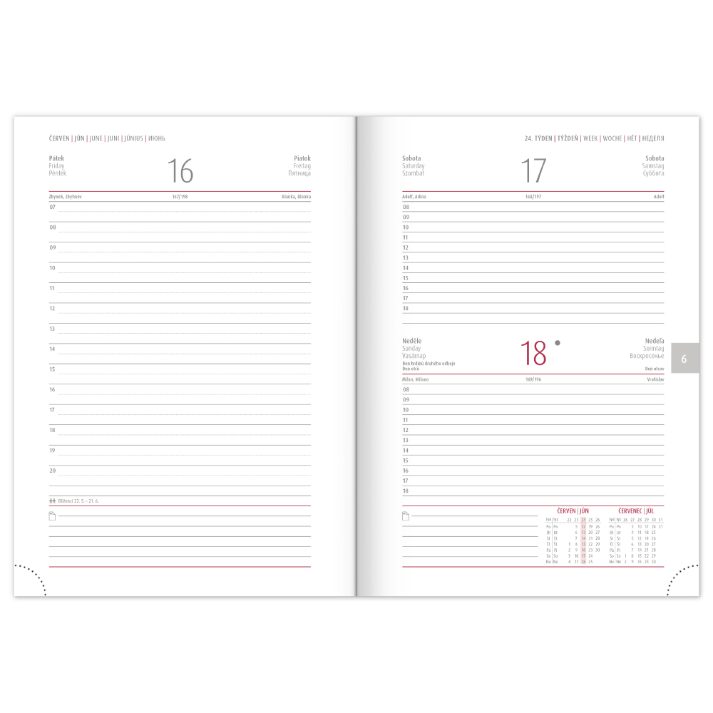 Diár obsahuje: miesto pre osobné údaje, mesačné plánovanie 2023 a 2024,