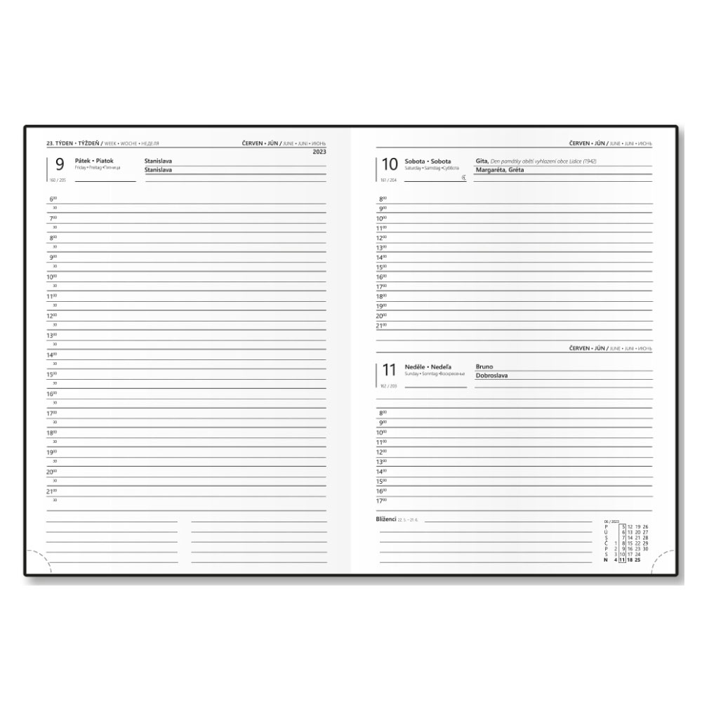 Rozmer: 120 x 165 mm Formát: B6 Kalendárium: denné české a slovenské menné Jazykové mutácie: CZ, SK, ANG, D, RU Poťahový materiál: nepoškrabateľné matné lamino s parciálnym lakom Papier: biely s perforovanými rožkami Počet strán: 336 Väzba: šitá Vä