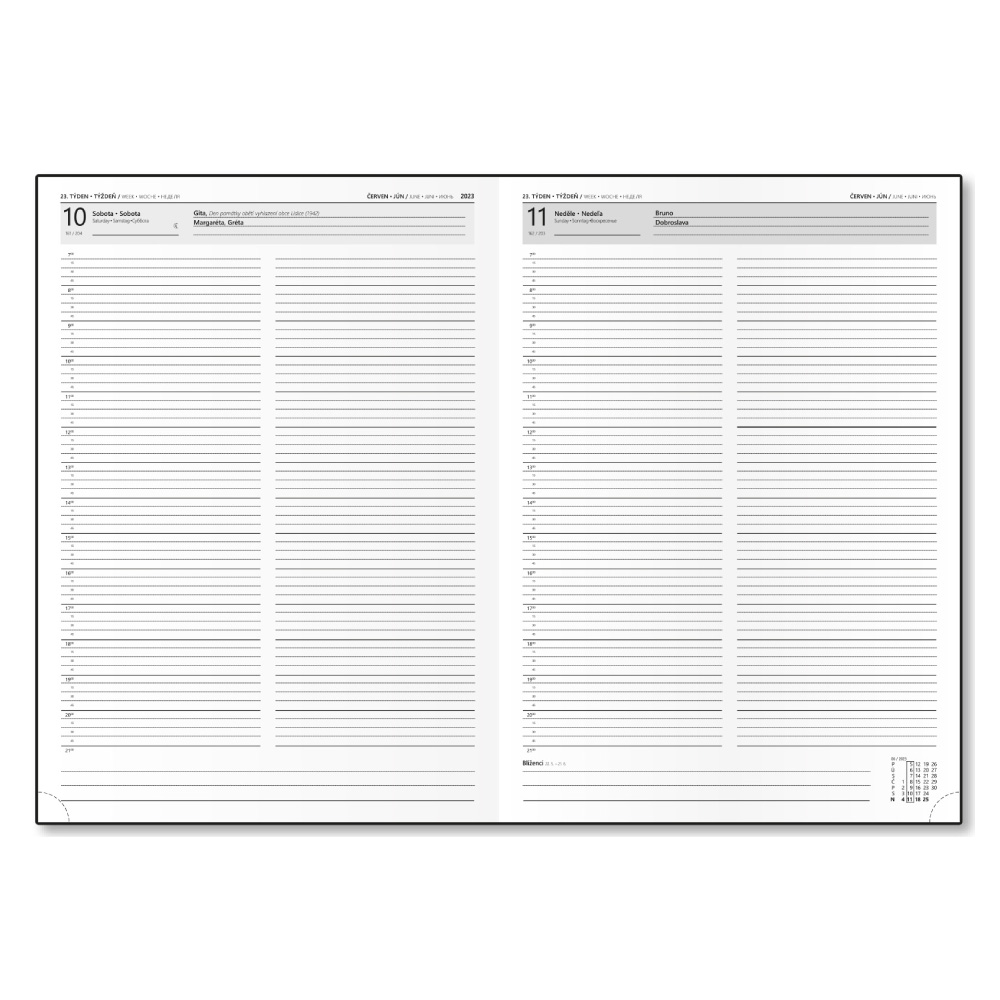 Rozmer: 200 x 280 mm Formát: A4 Kalendárium: denné české a slovenské menné (SO / NE zvlášť na stránke) Jazykové mutácie: CZ, SK, ANG, D, RU Poťahový materiál: jemný hladký materiál Papier: biely s perforovanými rožkami Počet strán: 368 Väzba: šitá