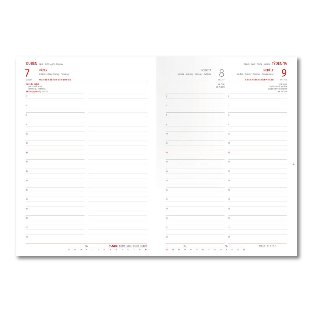 Rozmer: 148 x 210 mm Formát: A5 Kalendárium: české denné Rozsah: 352 strán Papier: biely Materiál dosiek: matná koženka Hlavný jazyk: čeština Ďalšie jazyky: SK, EN, DE, RU Infostrany obsahujú: plánovací kalendár, CZ/SK krstné mená, ročné plánov