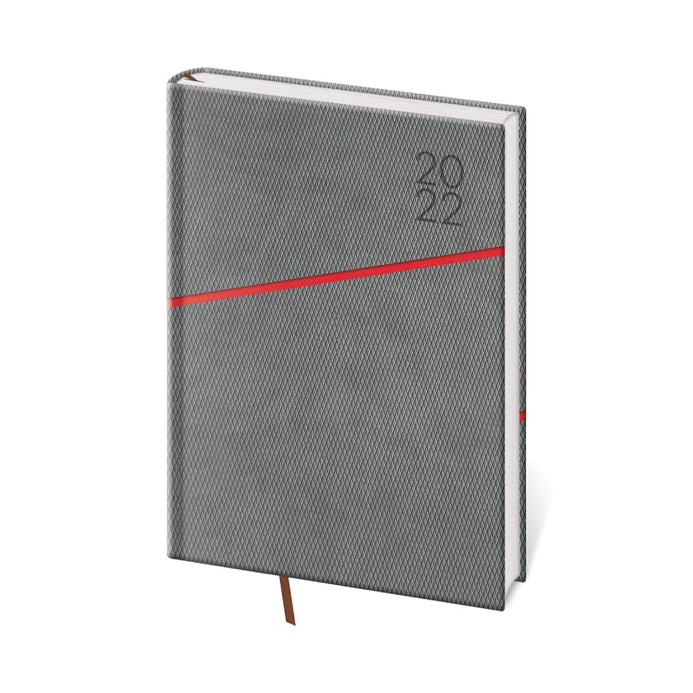 Rozmer: 143 x 205 mm Formát: A5 Kalendárium: denné české/slovenské Počet strán: 352 strán Farba bloku: biela Väzba: V8 Poťahový materiál: matná štruktúrovaná koženka Obsahuje: osobné údaje, plánovač dovolenky (mesačný prehľad), plánovací kalendá