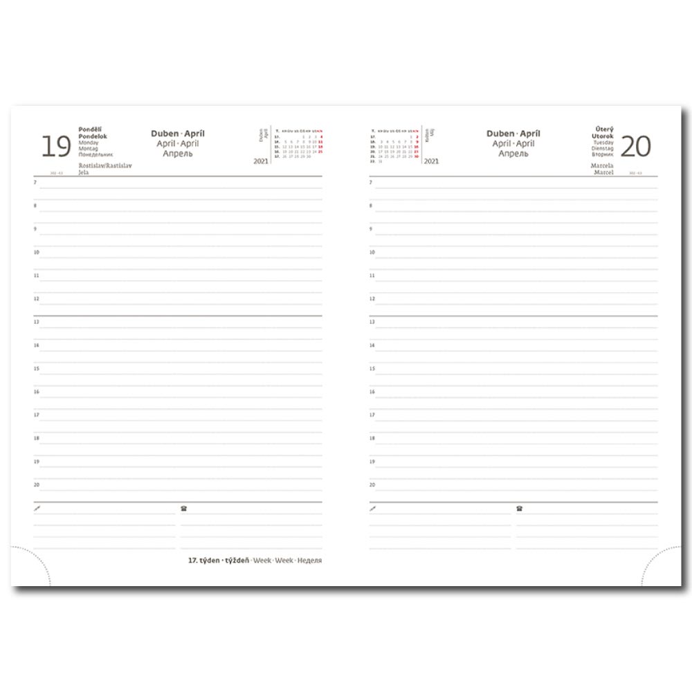 Rozmer: 143 x 205 mm Formát: A5 Kalendárium: denné české/slovenské Počet strán: 352 strán Farba bloku: biela Väzba: V8 Poťahový materiál: matná koženka Obsahuje: osobné údaje, plánovač dovolenky (mesačný prehľad), plánovací kalendár, telefónne p