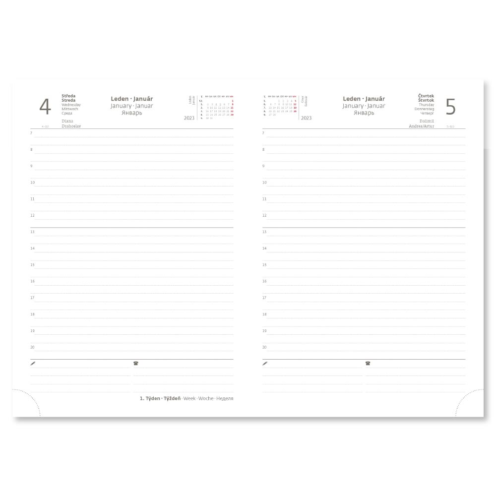 Rozmer: 145 x 205 mm Formát: A5 Kalendárium: denné české/slovenské Počet strán: 352 strán Farba bloku: biela Väzba: V8 Poťahový materiál: látkový štruktúrovaný Obsahuje: osobné údaje, plánovač dovolenky (mesačný prehľad), plánovací kalendár, tel