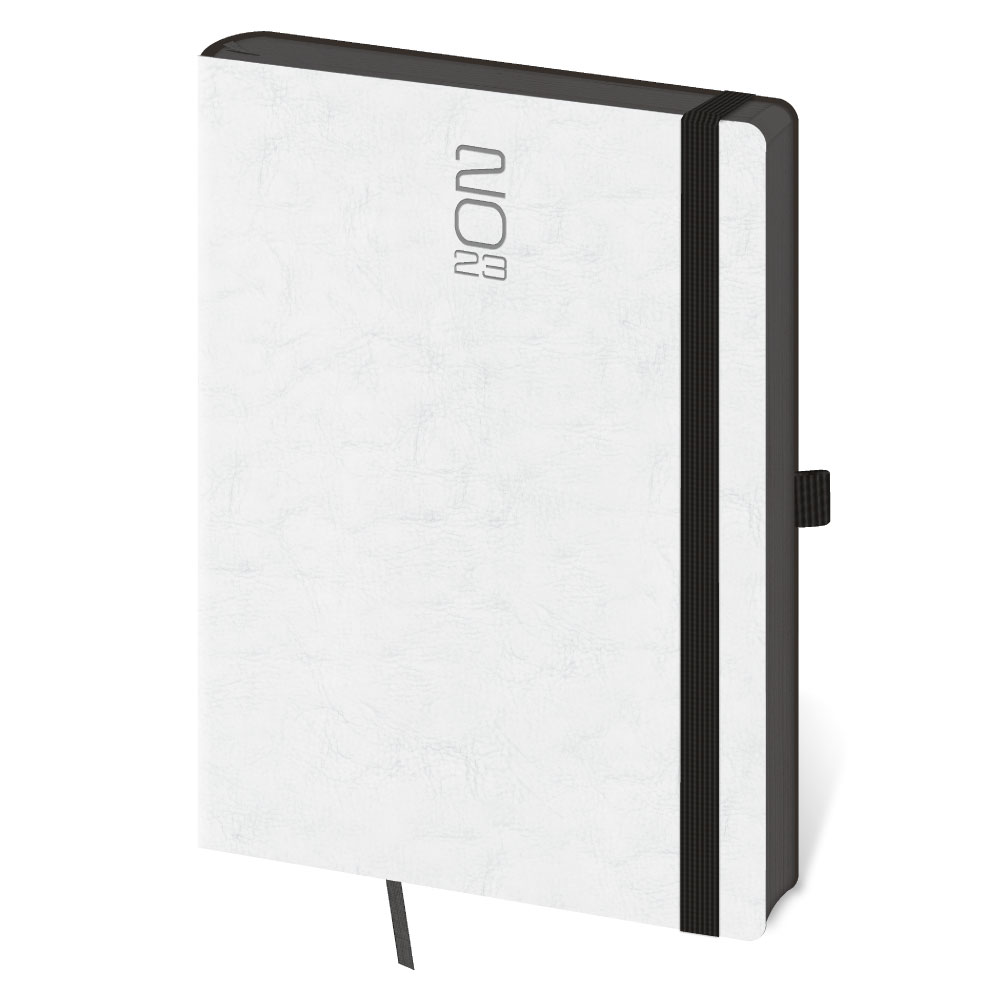 Súčasťou je papierová vrecko na zadných doskách, pútko pre pero a gumička na zatváranie.