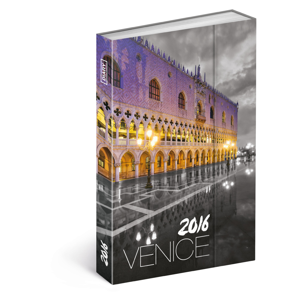 Diá Benátky týždenný B6 magnetický 2016 rozmer diára - 10,5 x 15,8 cm počet strán - 144 vnútorných strán na žltom papieri + 8 ilustrácií na bielom papieri papier - ilustrace 130 g/m2 - vnútorné strany 100 g/m2 kalendárium - týždenný vertikalne - od dece