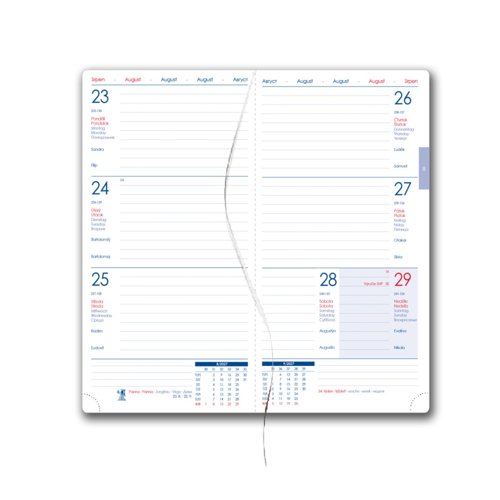 Formát: vreckový Rozmer bloku: 80 x 150 mm Rozsah: 144 strán Väzba: šitá V8 (tkaná niť) Kalendarium: týždenné poľskej menné Jazykové mutácie: PL, EN, DE, RU Farba bloku: biela Farba písma: modrá a červená Diár obsahuje: okrúhle odtrhávacie rožk