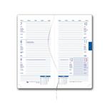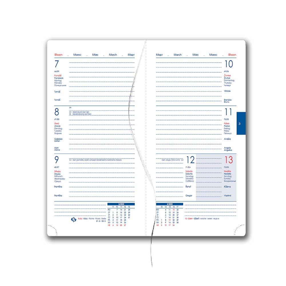Diár obsahuje: okrúhle odtrhávacie rožky, bielu záložku a pero