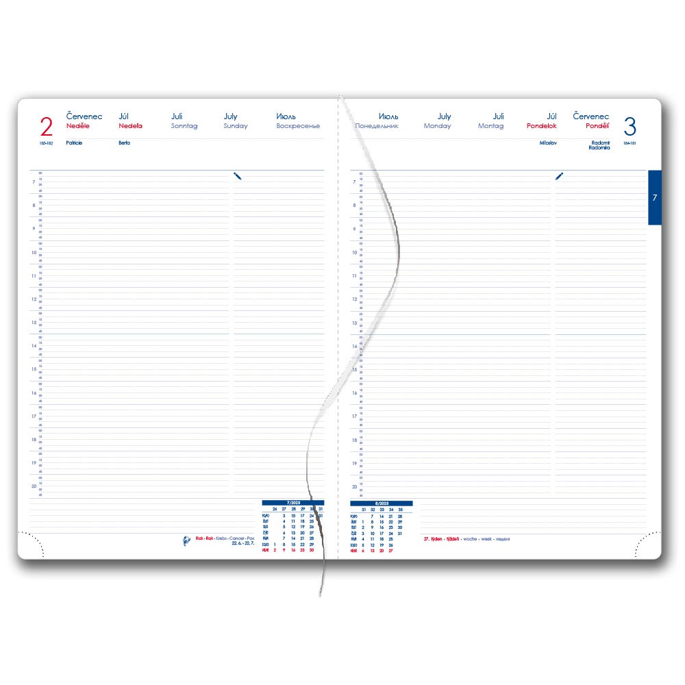 Diár obsahuje: okrúhle odtrhávcie rožky, bielu záložku a pero