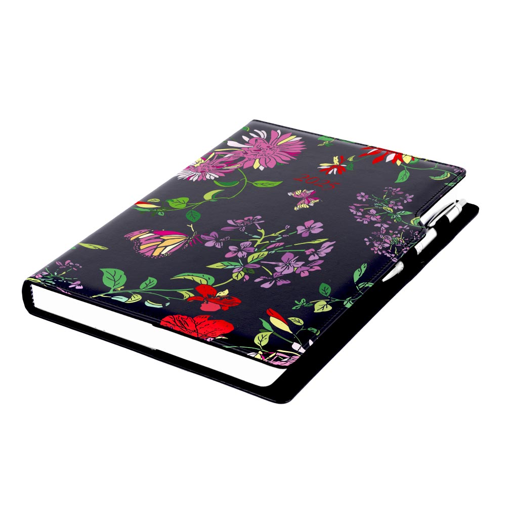 Diár DESIGN denný A4 2025 - čierna - kvety