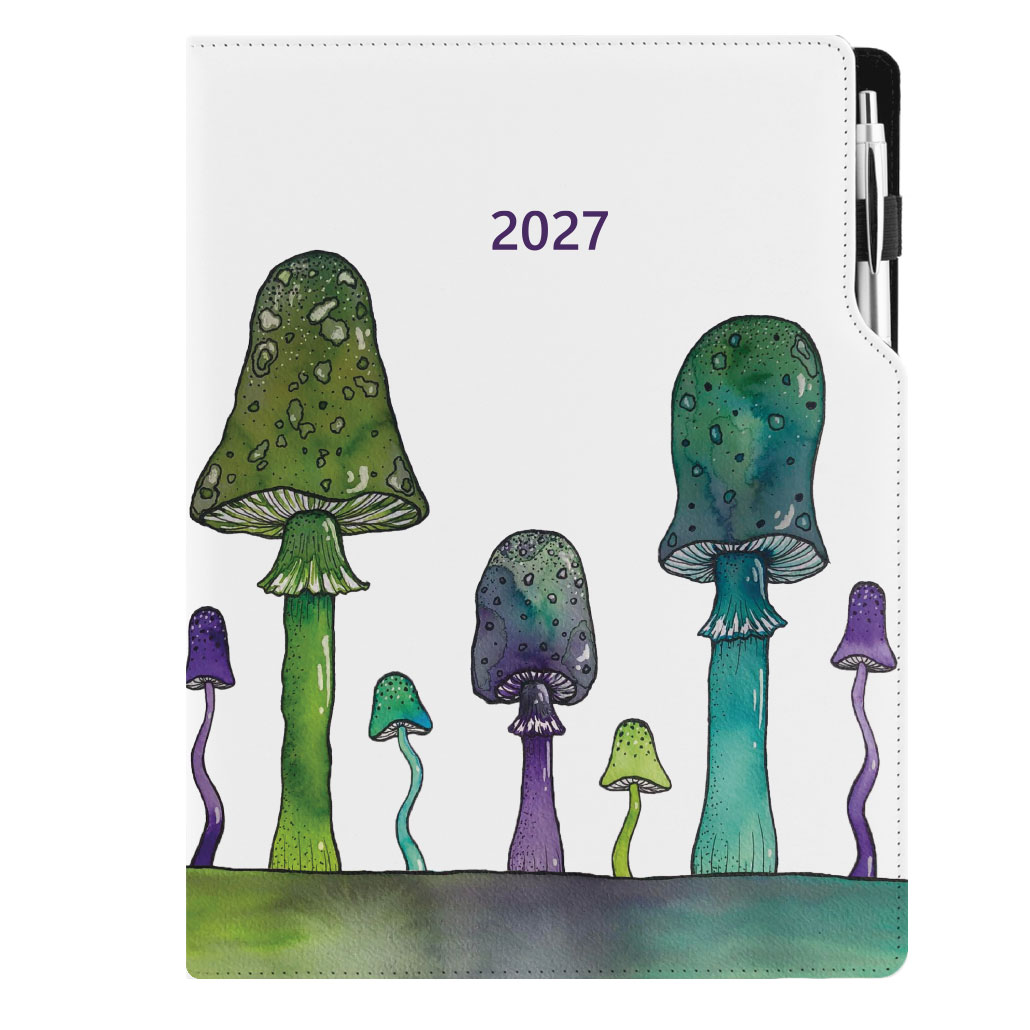 Diár obsahuje: okrúhle odtrhávcie rožky, bielu záložku a pero
