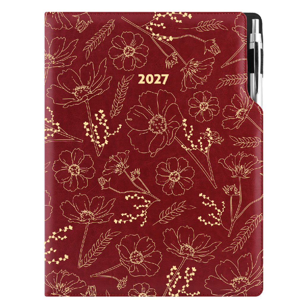 Diár DESIGN denný A4 2027 poľský - bordová - kvety