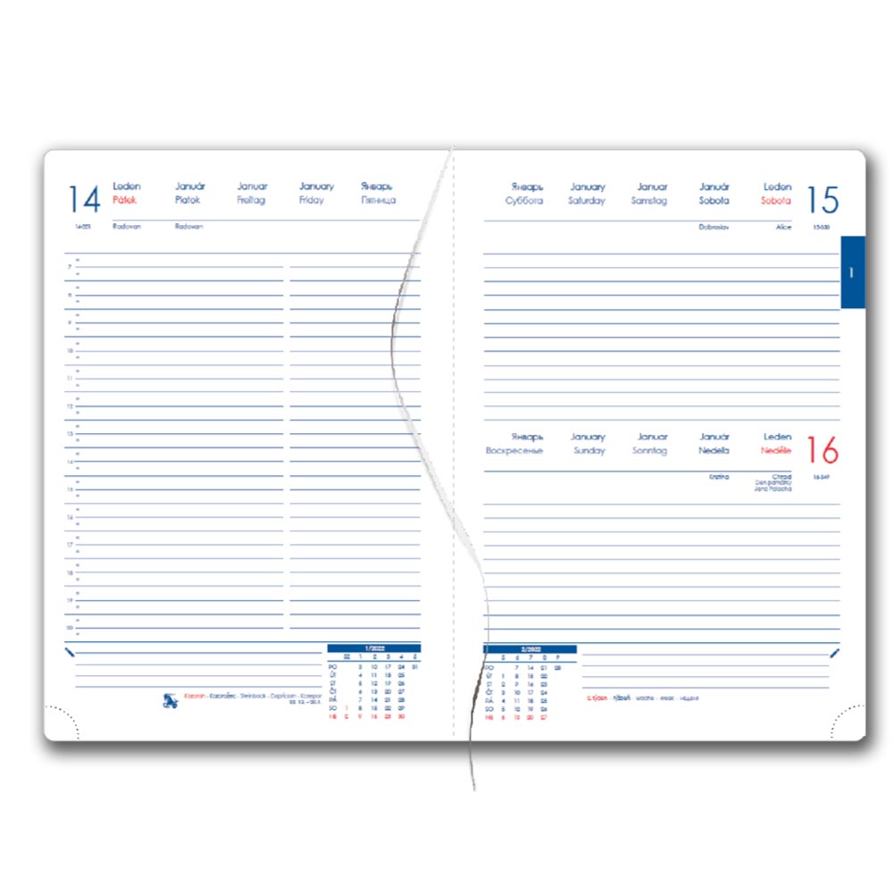 Diár obsahuje: okrúhle odtrhávacie rožky, bielu záložku a pero