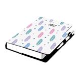 Diár obsahuje: okrúhle odtrhávacie rožky, bielu záložku a pero