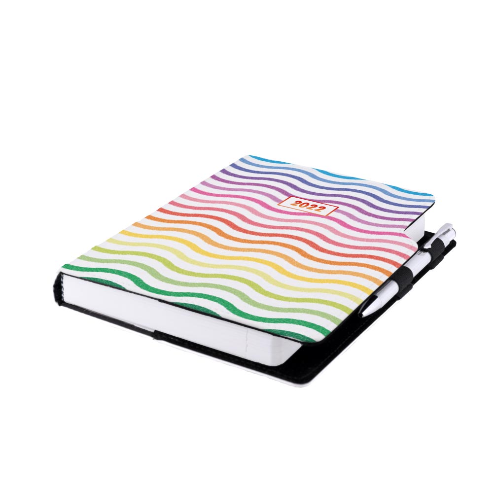 Diár obsahuje: okrúhle odtrhávacie rožky, bielu záložku a pero