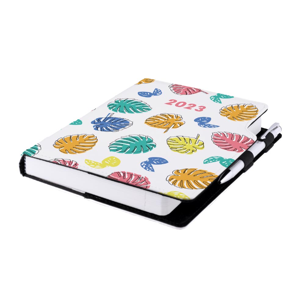 Diár obsahuje: okrúhle odtrhávcie rožky, bielu záložku a pero