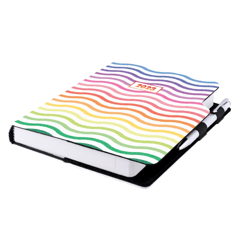 Diár obsahuje: okrúhle odtrhávacie rožky, bielu záložku a pero