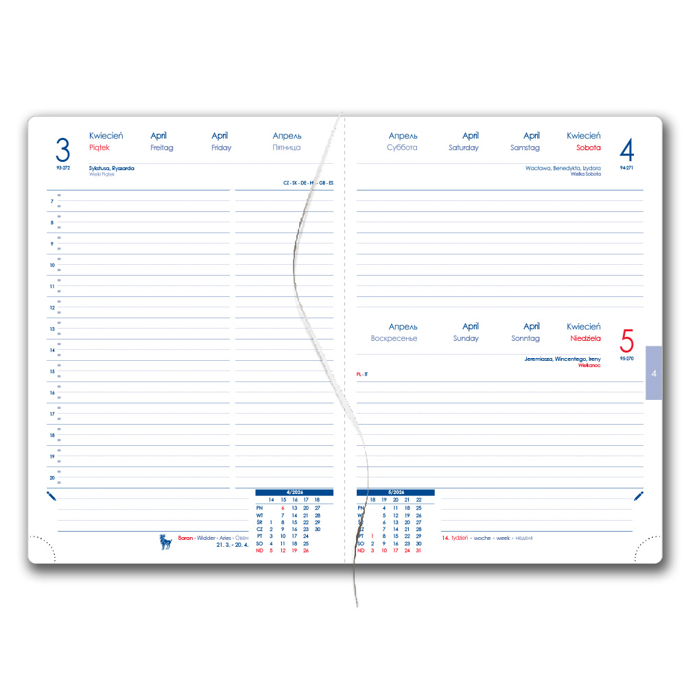 Formát: B6 Rozmer bloku: 120 x 165 mm Rozsah: 348 strán Väzba: šitá V8 (tkaná niť) Kalendárium: denné poľskej Jazykové mutácie: PL, EN, DE, RU Farba bloku: biela Farba písma: modrá a červená Diár obsahuje: okrúhle odtrhávacie rožky, bielu záložku a per