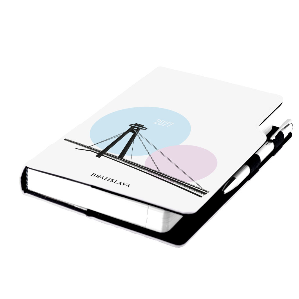 Diár obsahuje: okrúhle odtrhávcie rožky, bielu záložku a pero