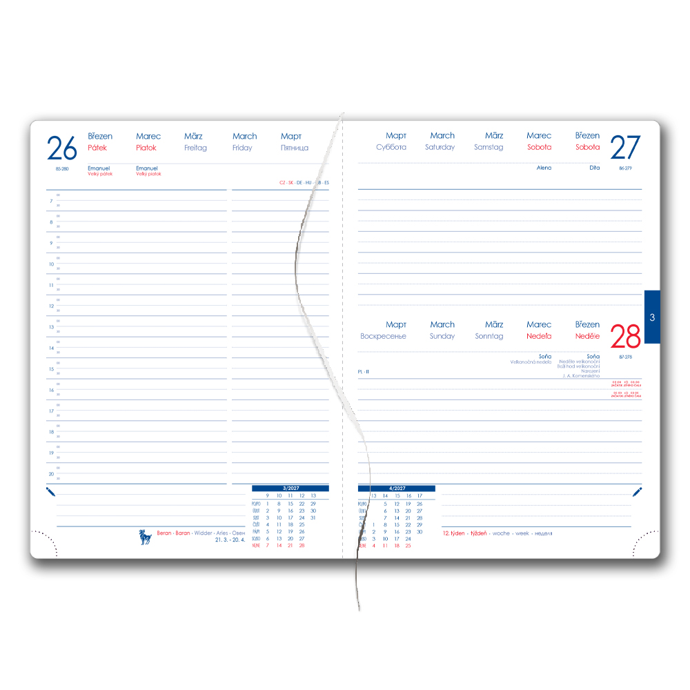 Diár obsahuje: okrúhle odtrhávcie rožky, bielu záložku a pero