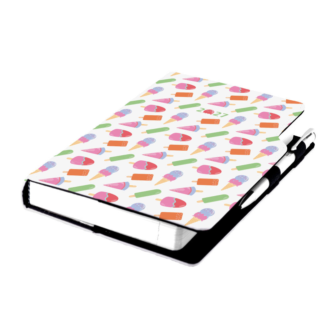 Diár obsahuje: okrúhle odtrhávcie rožky, bielu záložku a pero