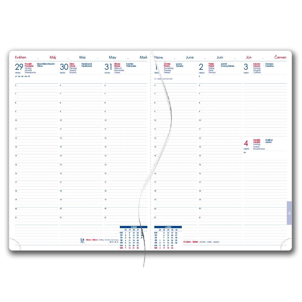 Formát: A4 Rozmer bloku: 143 x 206 mm Rozsah: 144 stran Väzba: šitá V8 (tkaná niť) Kalendárium: týždenné české a slovenské menné Jazykové mutace: CZ, SK, EN, DE, RU Farba bloku: biela Farba písma: modrá a červená Diár obsahuje: okrúhle odtrhávci