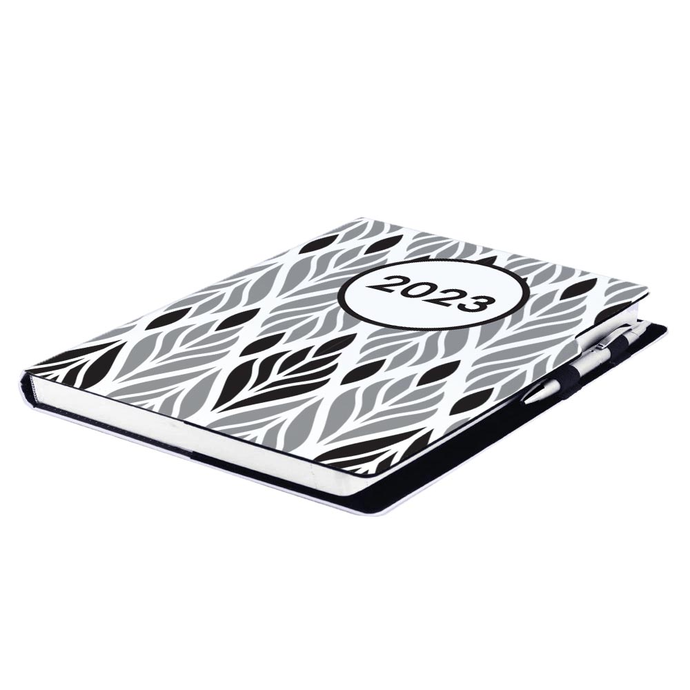 Diár obsahuje: okrúhle odtrhávacie rožky, bielu záložku a pero