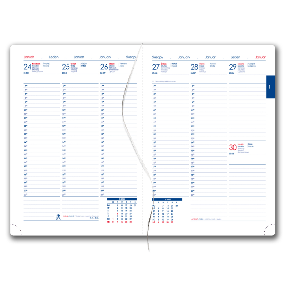 Formát: A5 Rozmer bloku: 143 x 206 mm Rozsah: 142 stran Väzba: šitá V8 (tkaná niť) Kalendárium: týždenné slovenské menné Jazykové mutácie: SK, CZ, EN, DE, RU Farba bloku: biela Farba písma: modrá a červená Diár obsahuje: okrúhle odtrhávacie rožk