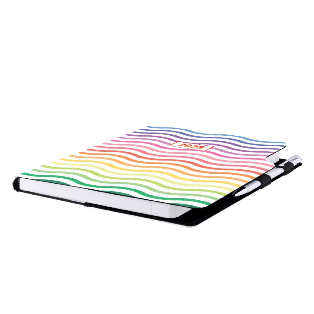 Diár obsahuje: okrúhle odtrhávacie rožky, bielu záložku a pero