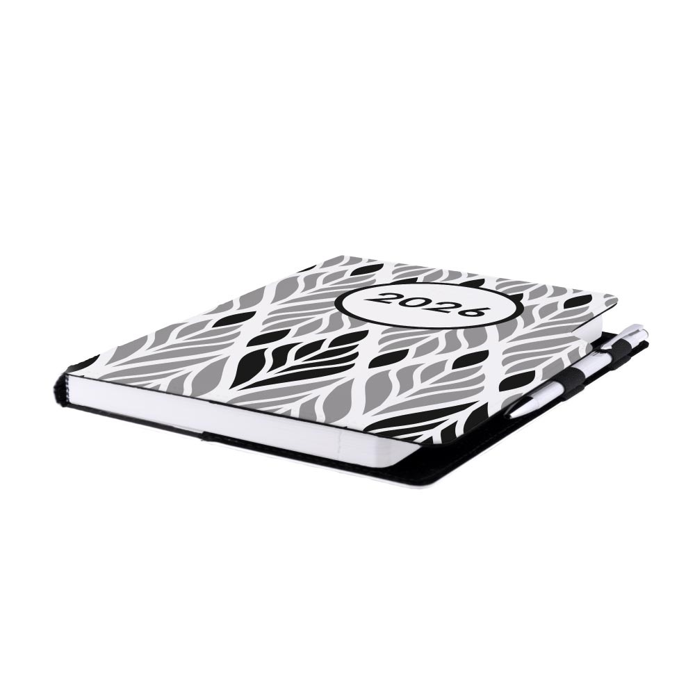 Diár obsahuje: okrúhle odtrhávacie rožky, bielu záložku a pero