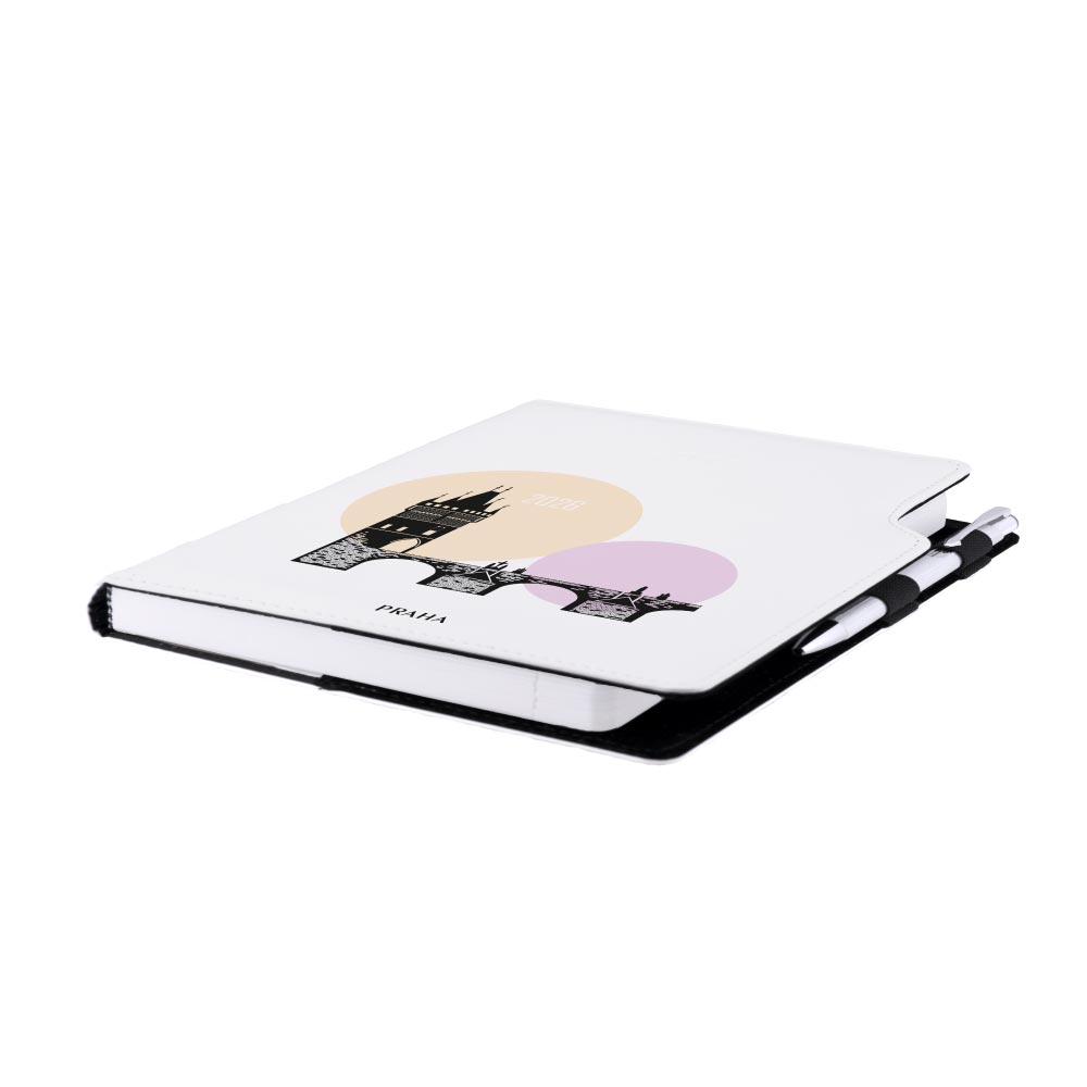 Diár obsahuje: okrúhle odtrhávacie rožky, bielu záložku a pero