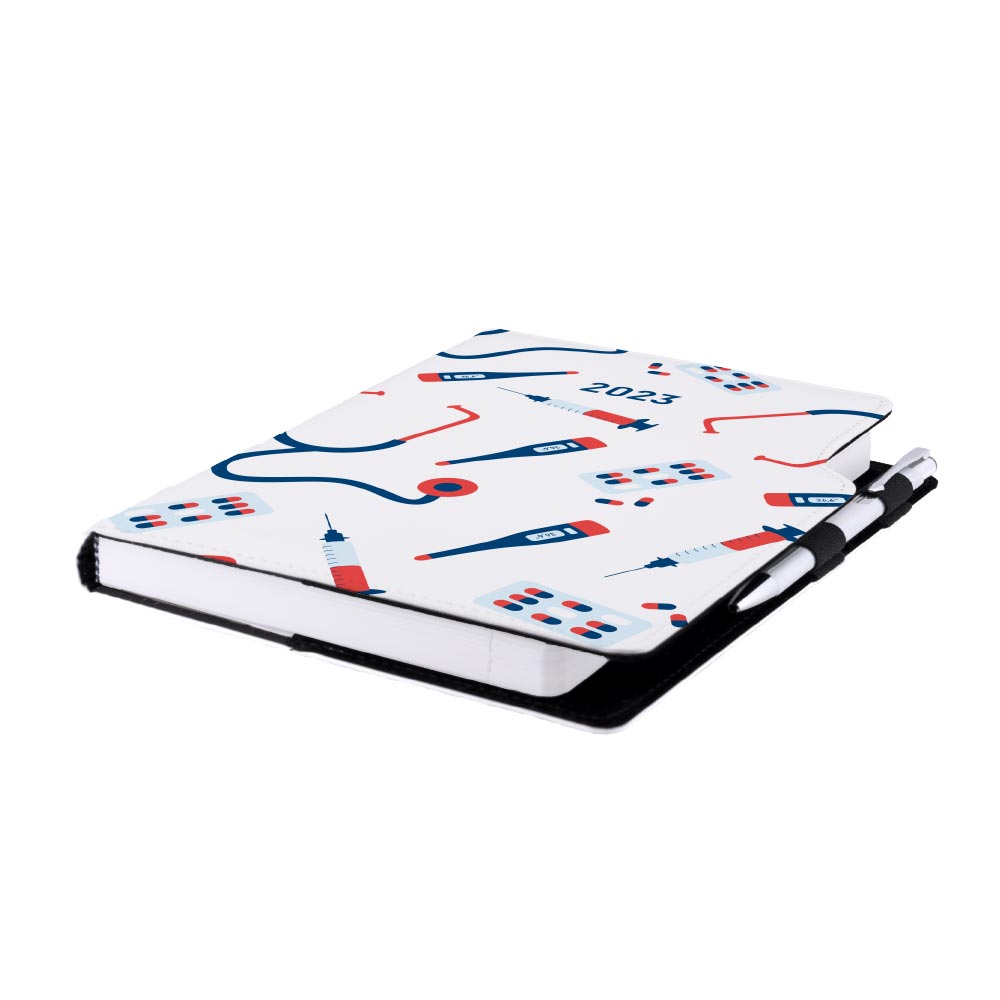 Diár obsahuje: okrúhle odtrhávcie rožky, bielu záložku a pero