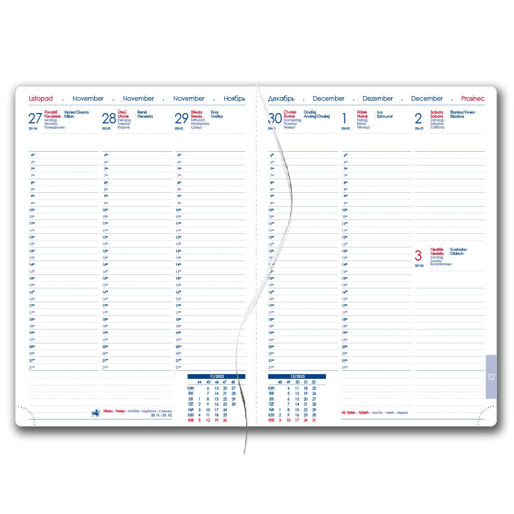 Diár obsahuje: okrúhle odtrhávcie rožky, bielu záložku a pero