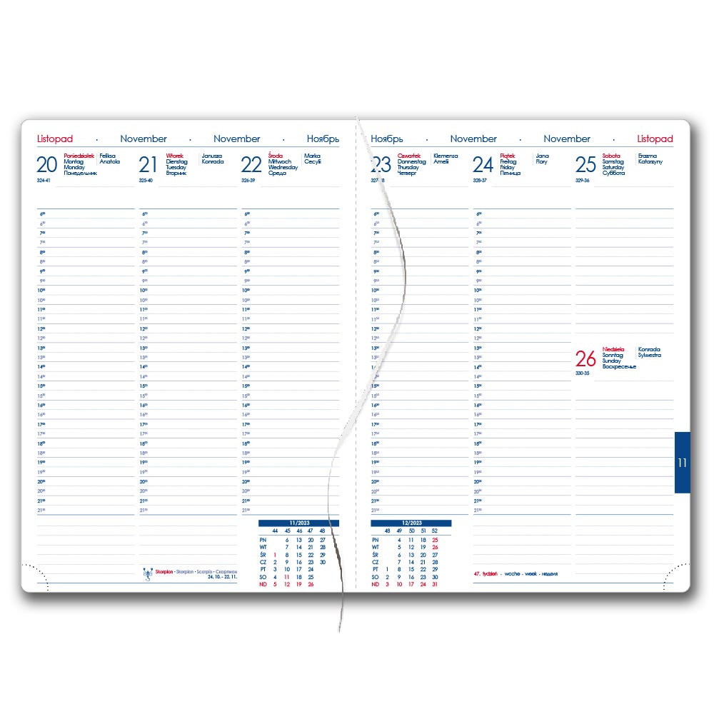 Formát: B5 Rozmer bloku: 170 x 240 mm Rozsah: 140 strán Väzba: šitá V8 (tkaná niť) Kalendarium: týždenné poľskej Jazykové mutácie: PL, EN, DE, RU Farba bloku: biela Farba písma: modrá a červená Diár obsahuje: okrúhle odtrhávacie rožky, bielu zá