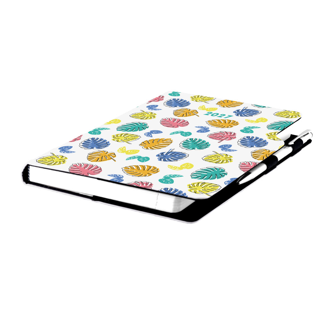 Diár obsahuje: okrúhle odtrhávcie rožky, bielu záložku a pero