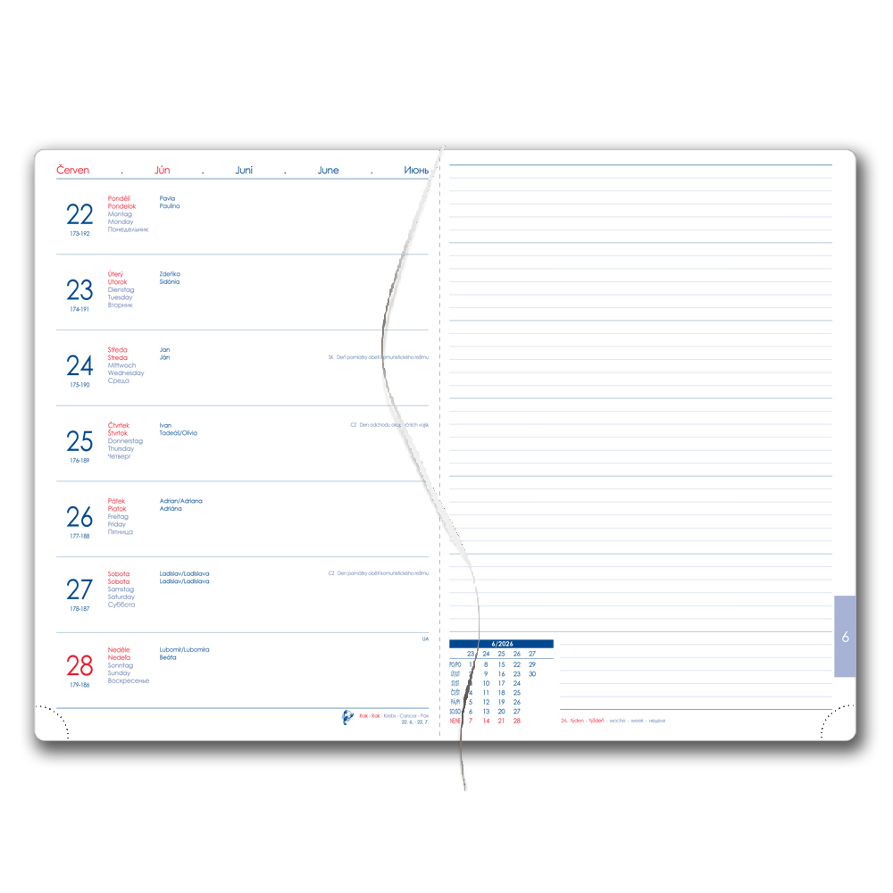 Kalendárium: týždenné menné CZ/SK na jednej strane + samostatná strana na poznámky