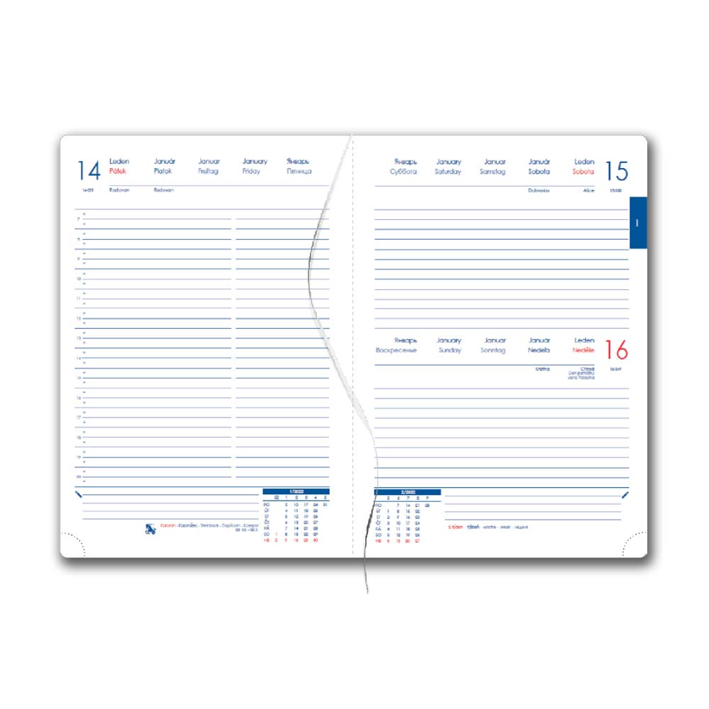 Formát: A5 Rozmer bloku: 143 x 206 mm Rozsah: 350 stran Väzba: šitá V8 (tkaná nit) Kalendárium: denné české menné Jazykové mutácie: CZ, SK, EN, DE, RU Farba bloku: biela Farba písma: modrá a červená Poťahový materiál: vzorovaná matná koženka Di
