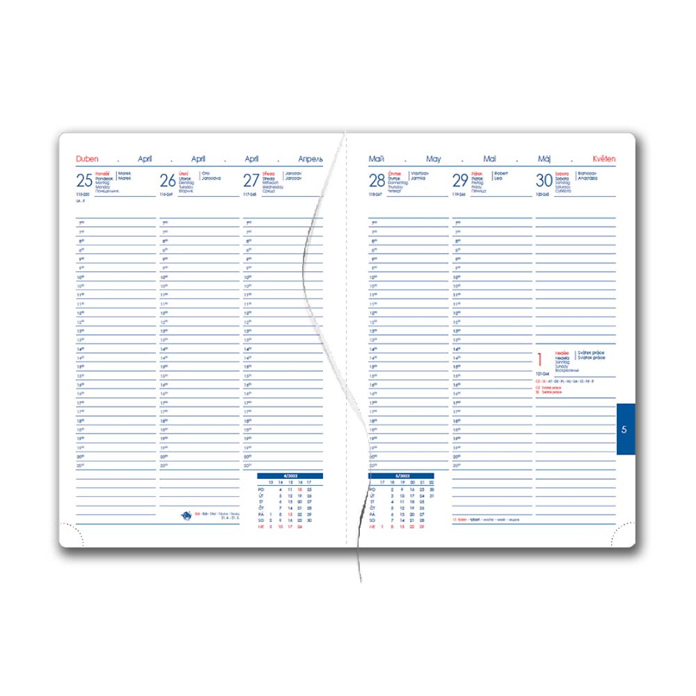 Formát: A5 Rozmer bloku: 143 x 206 mm Rozsah: 142 stran Väzba: šitá V8 (tkaná nit) Kalendárium: týždenné české menné Jazykové mutácie: CZ, SK, EN, DE, RU Farba bloku: biela Farba písma: modrá a červená Poťahový materiál: vzorovaná matná koženka
