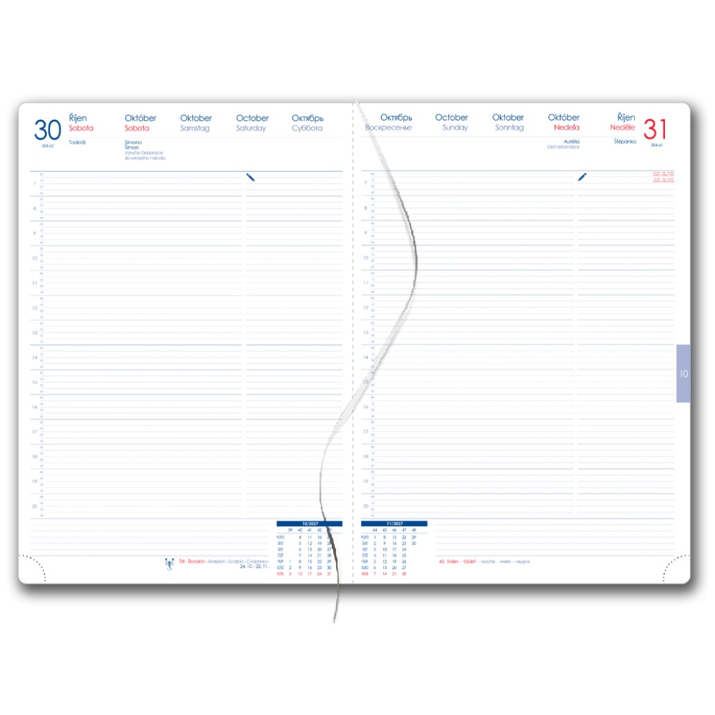 Diár obsahuje: okrúhle odtrhávcie rožky, bielu záložku a pero