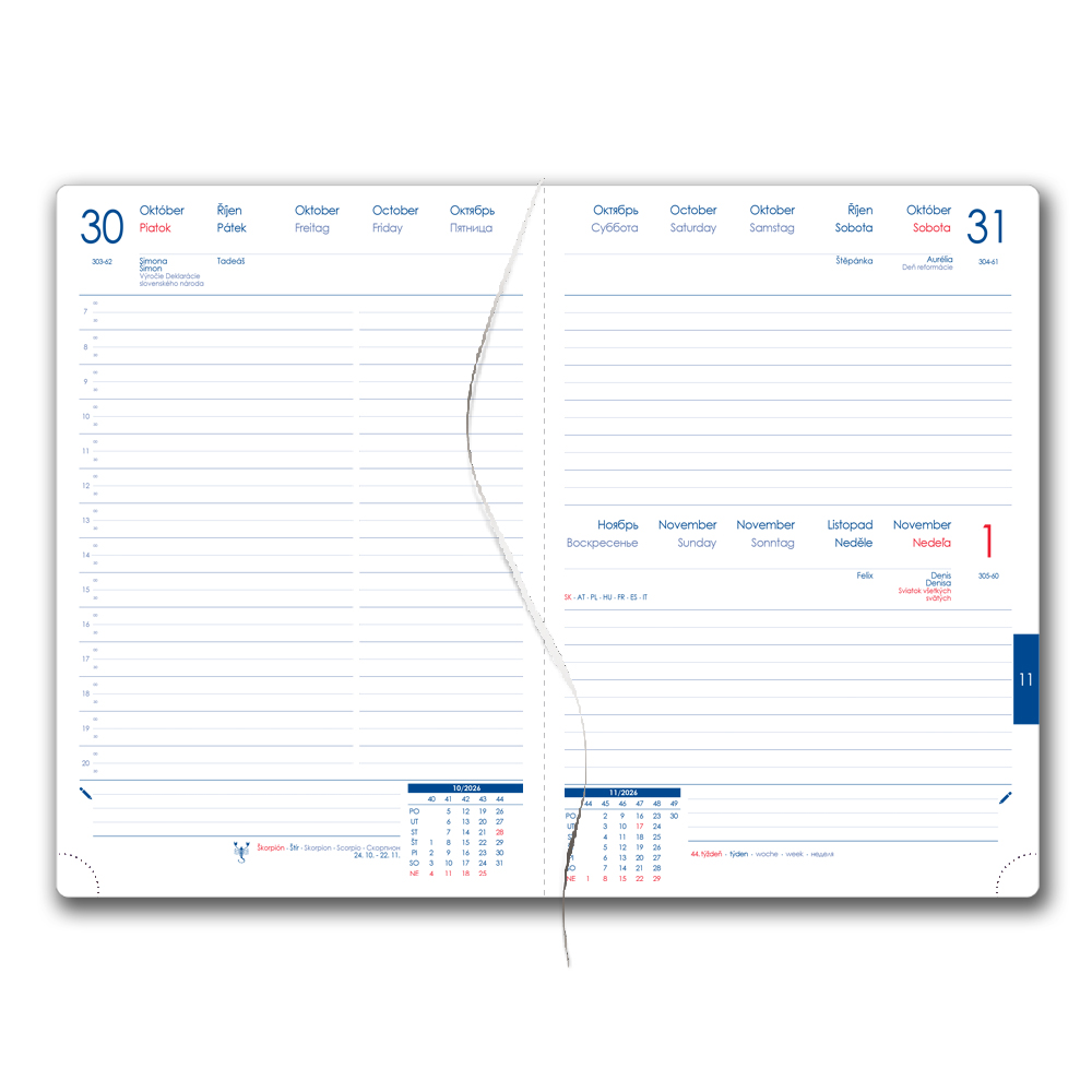 Diár obsahuje: okrúhle odtrhávacie rožky, bielu záložku a pero