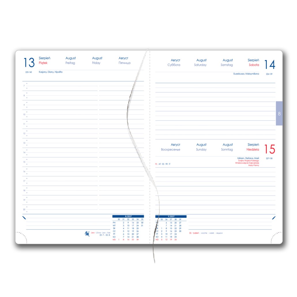 Formát: A5 Rozmer bloku: 143 x 205 mm Rozsah: 348 strán Väzba: šitá V8 (tkaná niť) Kalendárium: denné poľskej menné Jazykové mutácie: PL, EN, DE, RU Farba bloku: biela Farba písma: modrá a červená Diár obsahuje: krúhle odtrhávacie rožky, bielu