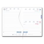 Diár obsahuje: krúhle odtrhávacie rožky, bielu záložku a pero