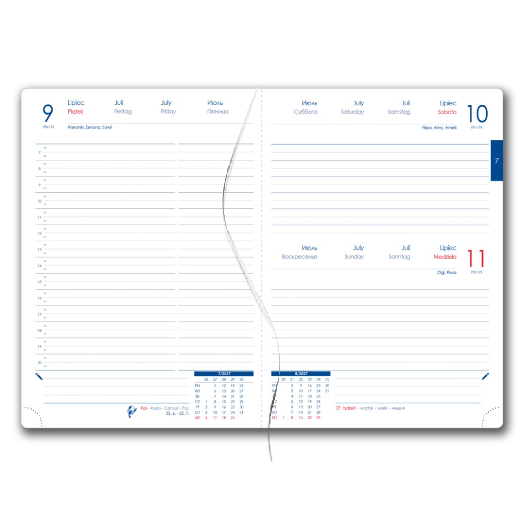 Formát: B6 Rozmer bloku: 120 x 165 mm Rozsah: 348 strán Väzba: šitá V8 (tkaná niť) Kalendárium: denné poľskej menné Jazykové mutácie: PL, EN, DE, RU Farba bloku: biela Farba písma: modrá a červená Diár obsahuje: krúhle odtrhávacie rožky, bielu
