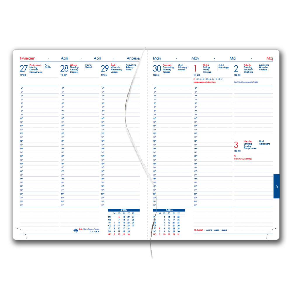 Diár obsahuje: krúhle odtrhávacie rožky, bielu záložku a pero