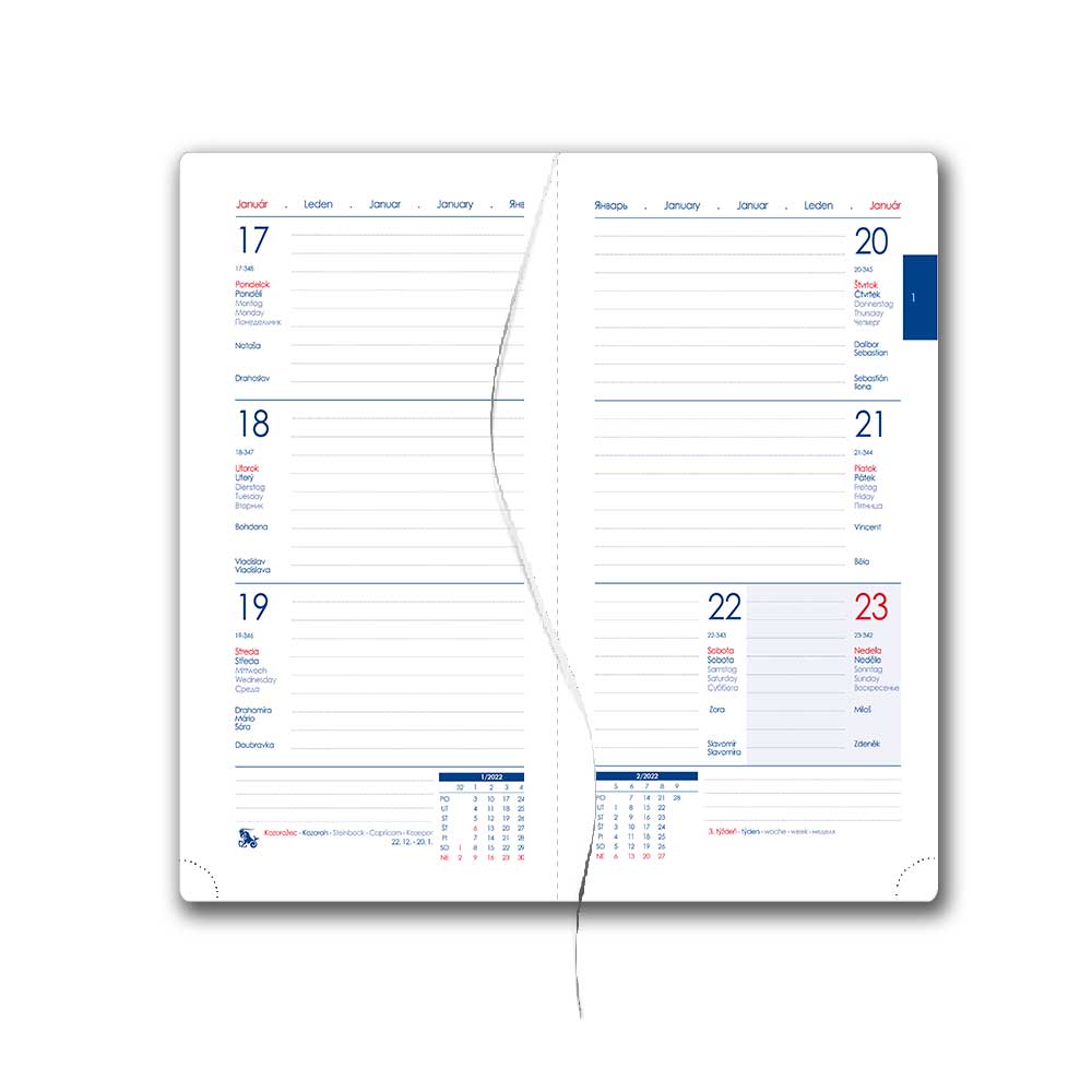 Diár obsahuje: okrúhle odtrhávacie rožky, bielu záložku a pero