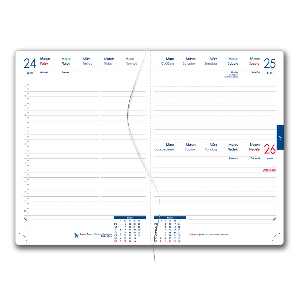 Diár obsahuje: okrúhle odtrhávacie rožky, bielu záložku a pero