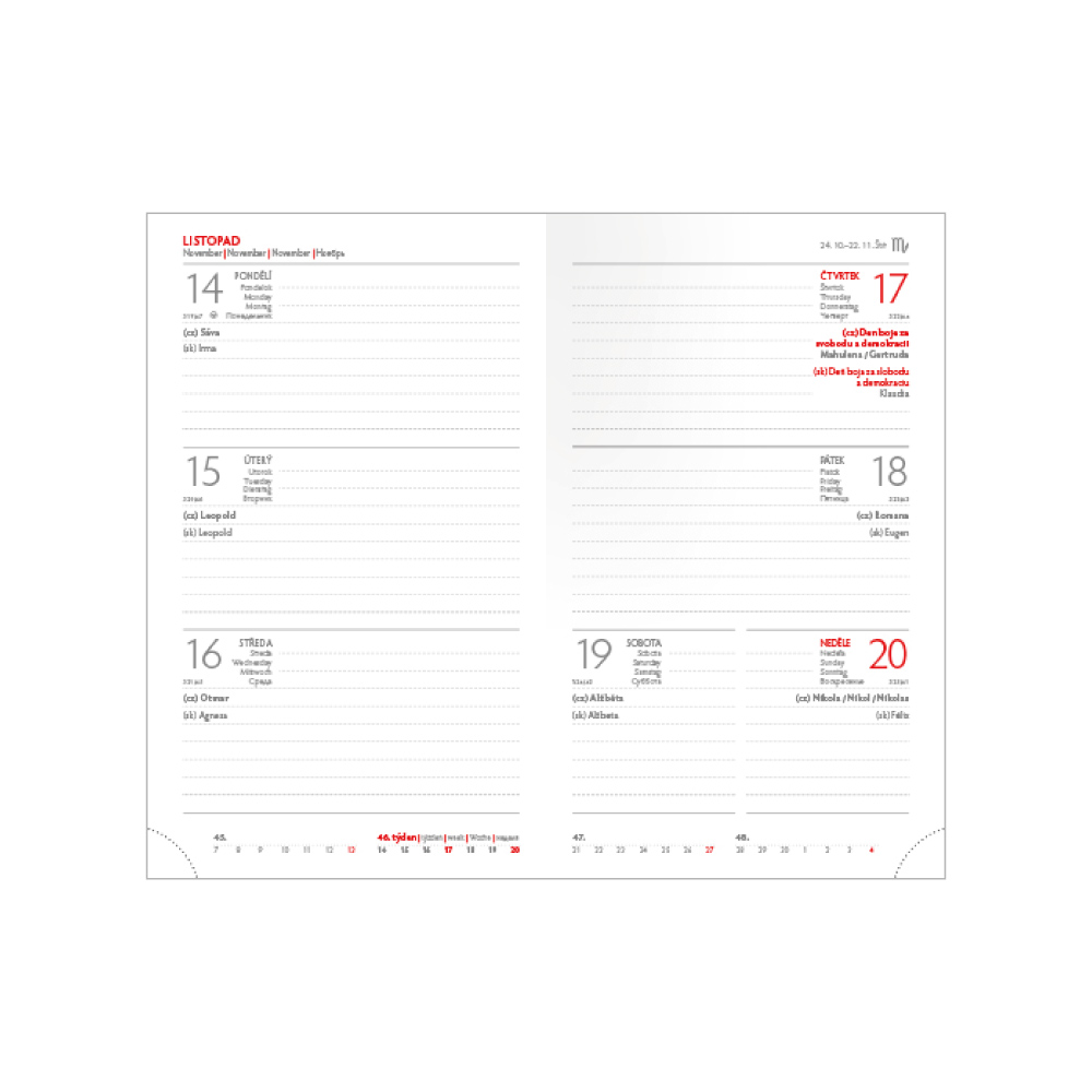 Diár Karmé 2016 týždenný vreckový - červený Formát: 90 x 150 mm Kalendárium: týždenný Rozsah: 144 strán, papier - biely Materiál dosiek: koženka Hlavný jazyk: čeština, dalšie jazyky: SK, ANG, D, RU Infostrany: české a slovenské štátné sviatky, české a slo